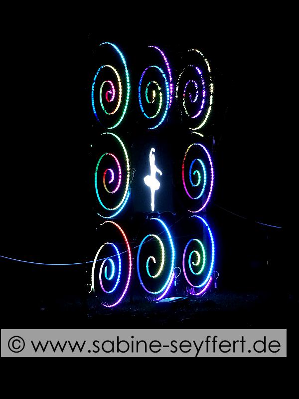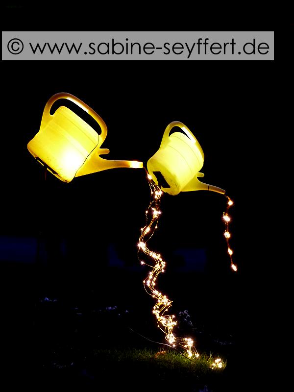 Noch ist es nicht ganz dunkel, aber die Lichter und Farben verwandeln schon jetzt die Bäume und die Landschaft in ganz kunstvolle Objekte. Wir schlendern gemütlich durch eine bunte Allee von Bäumen und kommen an einem Schwung leuchtender Gießkannen vorbei, ein ausgesprochen tolles „Bild“.