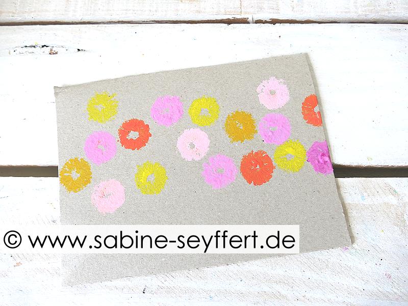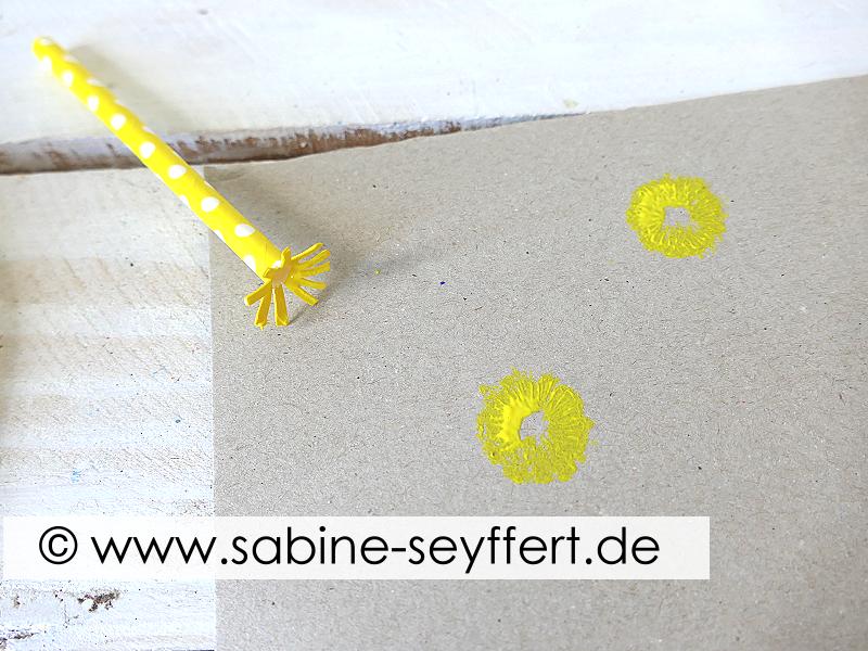 Dann stempel damit eine Blüte auf die Pappe. Bewege den Strohhalm nach jedem Aufdruck ein kleines Stück im Kreis, so dass eine buschige Blüte entsteht.