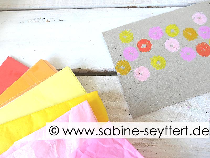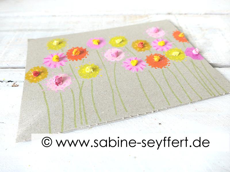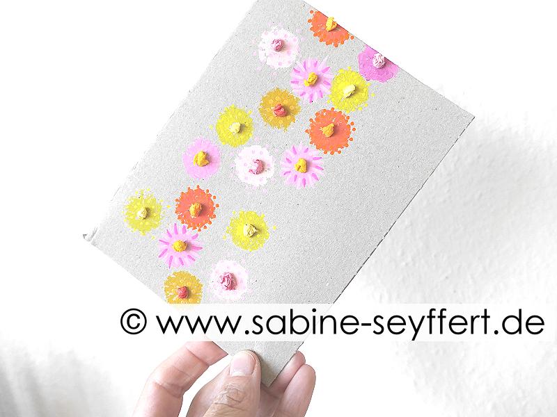 Drucke auf diese Weise viele bunte Blüten auf die Karte.