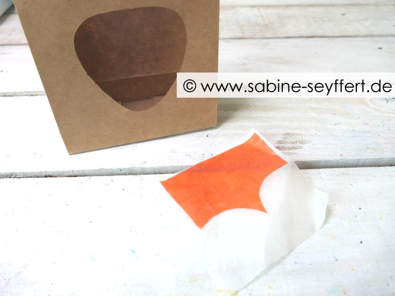 Aus weißem Transparentpapier habe ich ein großes Viereck geschnitten, das sich hinter die Öffnung kleben lässt. Doch vorher braucht ihr noch einen Streifen orangefarbenes Papier, das ihr in der Mitte spitz zuschneidet, so dass die obere Gesichtspartie vom Fuchs entsteht. Auf den Detailbildern ist das gut sichtbar.