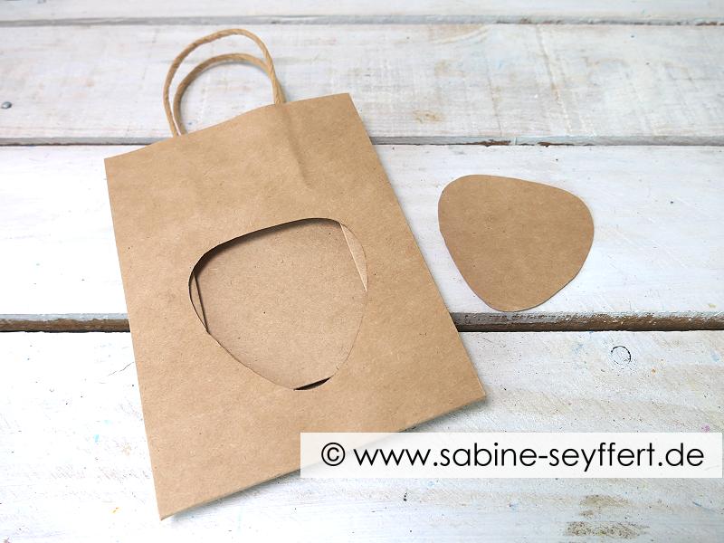 Da ich eine wirklich kleine Papiertasche für die Laterne verwendet habe, habe ich zum heraustrennen ein Bastelmesser benutzt. Allerdings müsst ihr in dem Fall ein dickeres Stück Pappe in die Tüte schieben, damit nur das Papier herausgetrennt wird, was auch raus soll. Es klappt aber auch mit einer Schere und falls ihr eine große Tüte für den Lampion nehmen wollt, ist das überhaupt kein Problem.