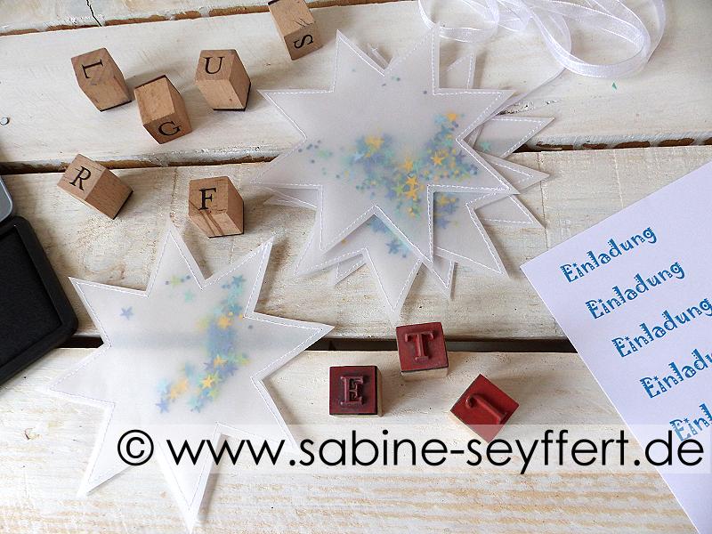 Die Sterne haben wir mit Buchstabenstempel mit dem Namen der Gäste bedruckt. Achtung – die Stempelfarbe muss gut trocknen, damit diese auf dem Papier nicht verschmiert.