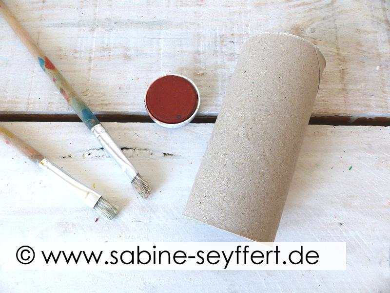 Leere Klorollen, leere Eierkartons (falls davon keine zum Basteln vorhanden sind, verwendet normale Pappe oder eine weitere Papprolle!), ein Stück dünne Pappe, eine alte Tageszeitung, einen Wasserfarbkasten inclusiv Deckweiß, eine Bastelschere, Pinsel, Bastelkleber sowie einen weißen Buntstift
