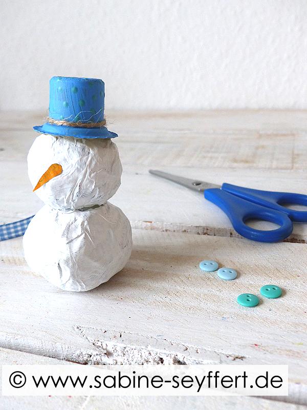Nach dem Trocknen bemalt man den Schneemann sowie den Hut und klebt diesen oben drauf. Jetzt kann jeder seinen Schneemann noch mit Knöpfen, Geschenkband (Filzresten, Stoffresten, Bändern o.ä.) verzieren.