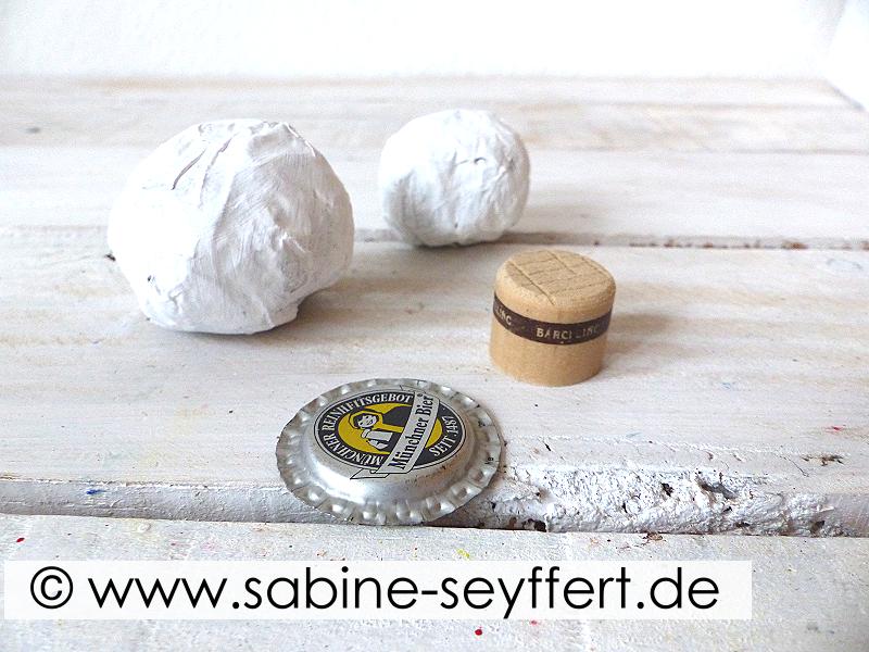 Eine alte Tageszeitung, Tapetenkleister Pulver, Leitungswasser, einen Kronkorken, einen Hammer, etwas Geschenkband, einen Korken (Weinkorken), bunte Bastelfarben (auf jeden Fall in Weiß), kleine bunte Köpfe, dünne Kordel, ein scharfes Messer, Bastelunterlage & Malkittel