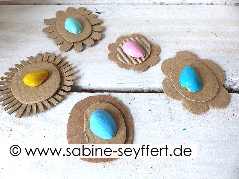 Außerdem schnippelt ihr aus dünner Pappe ein paar Blüten und mal diese an. Auch die Pistazien Schalen werden angemalt.