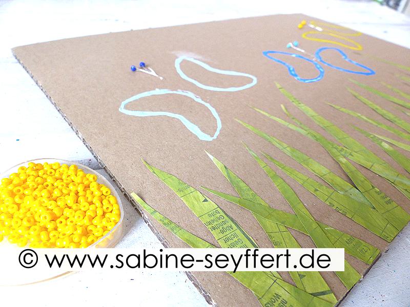 Zum Schluss schneidet ihr aus dem grün bemalten Papier noch Grashalme für die Wiese und klebt diese an den unteren Rand.