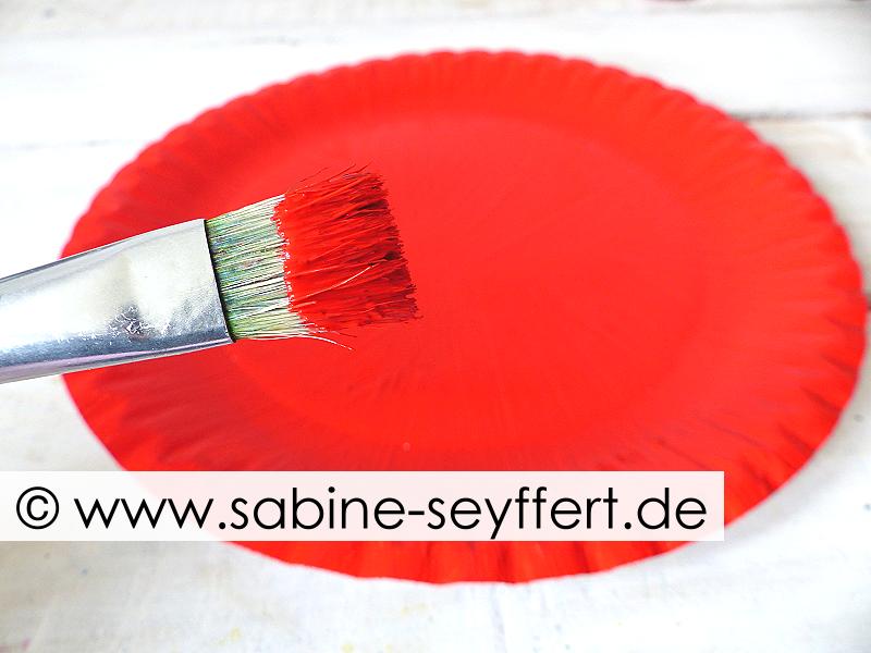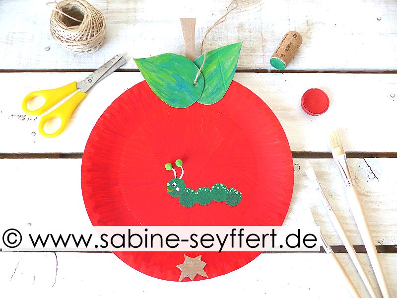 Den Pappteller bemalt man in rot. Sobald da die Farbe ganz getrocknet ist (das klappt mit Acrylfarbe sehr schnell), kann man mit grüner Farbe und einem Flaschenkorken einen kleinen Wurm mittig draufstempeln.
