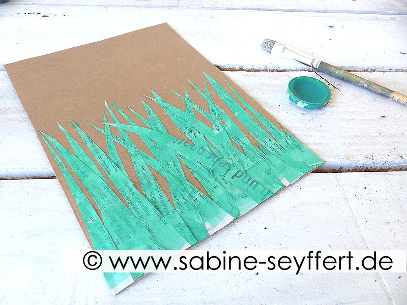 Dazu schneidet ihr als erstes aus dem grünen Zeitungspapier lange Grashalme und klebt diese an den unteren Rand der Pappe.