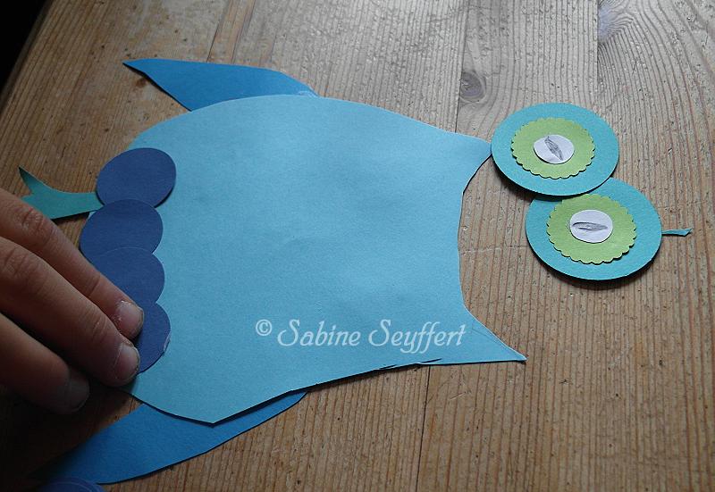 Ebenfalls mit dem Lochstanzer hat meine Tochter das „Federkleid“ der Eulen ausgestanzt und aufgeklebt.