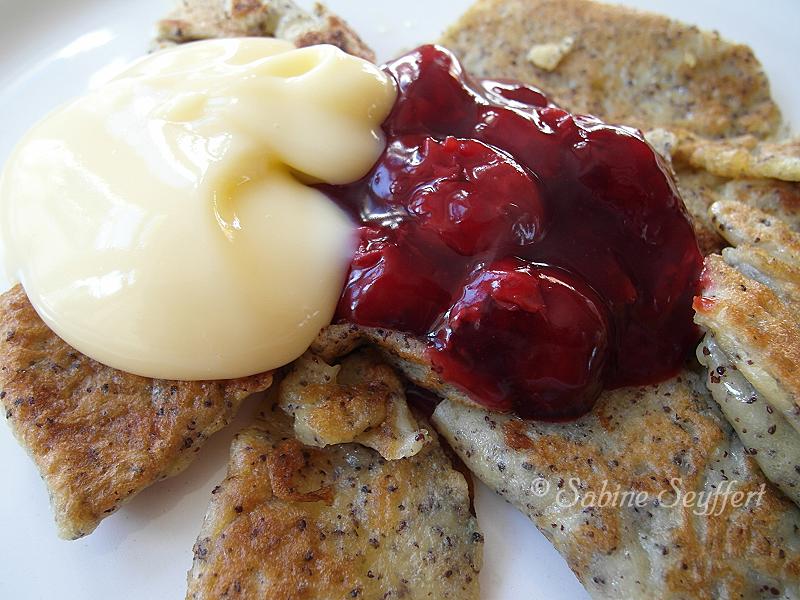 Ca. 800 gr Mehl, 5-6 Eier, 800ml Milch (alternativ kann man auch Sojamilch oder Wasser verwenden), 1 Vanillezucker, 1-2 Tropfen Bittermandel Aroma, 150-200 gr. Zucker, Fett für die Pfanne, 100 gr gemahlener Mohn, 500 gr Kirschen (in meinem Fall waren es tiefgefrorene), 500 gr Vanillepudding