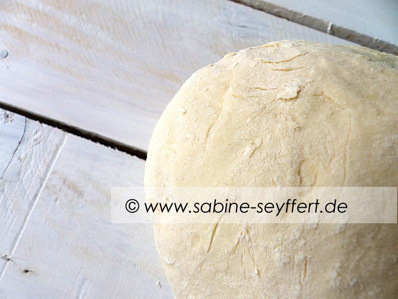 Dieses gebe ich nach und nach zu der Mehlmischung und kann daher die exakte Menge nicht nennen. Der Teig sollte feucht sein aber nicht mehr an den Händen kleben! Den fertigen Teig deckt man ab und lässt ihn 30-60 Minuten ruhen.