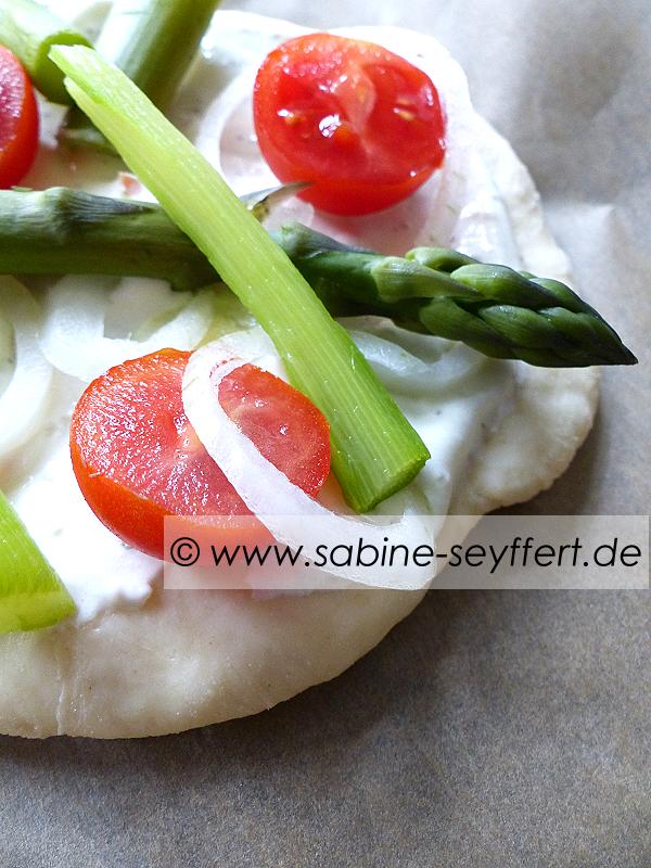 Auf dem Teig verteilt man das Cremefraiche und würzt dieses mit Pfeffer und Kräutersalz. Anschließend gibt man Zwiebelringe, Tomatenhälften und den Spargel darauf. Ganz zum Schluss belegt man den Flammkuchen mit Ziegenkäse.