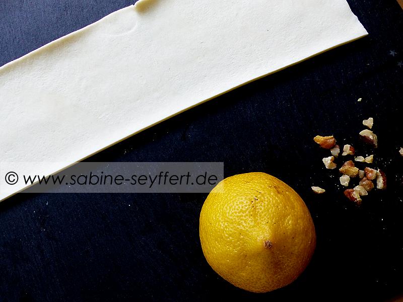 2 Packungen frischen Blätterteig, 1-2 Äpfel, 2 Esslöffel Zitronensaft, 100 ml Apfelsaft, 100 gr Marzipanrohmasse, 80 gr Samtmarmelade hell (in unserem Fall die Sorte „Mango-Maracuja“), eine handvoll Walnüsse