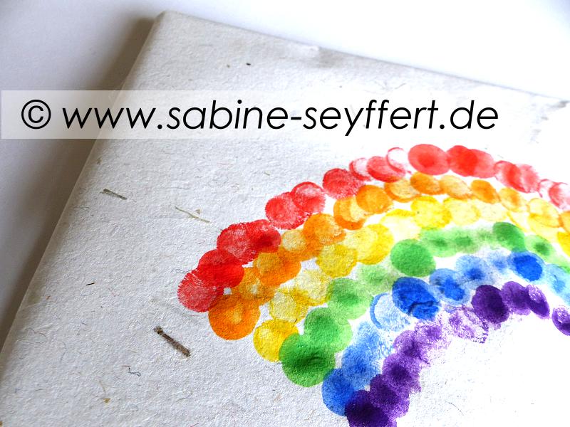 Also mit dem roten Finger einen Abdruck nach dem nächsten auf das Papier drucken. In einem schönen großen Bogen, so dass die folgenden Farben ebenfalls Platz darunter finden. Zwischendurch muss der Finger immer mal wieder ins Wasser und in die Farbe. Anschließend folgten gepunktete Fingerabdrücke in Orange, Gelb, Grün, Blau und Lila.