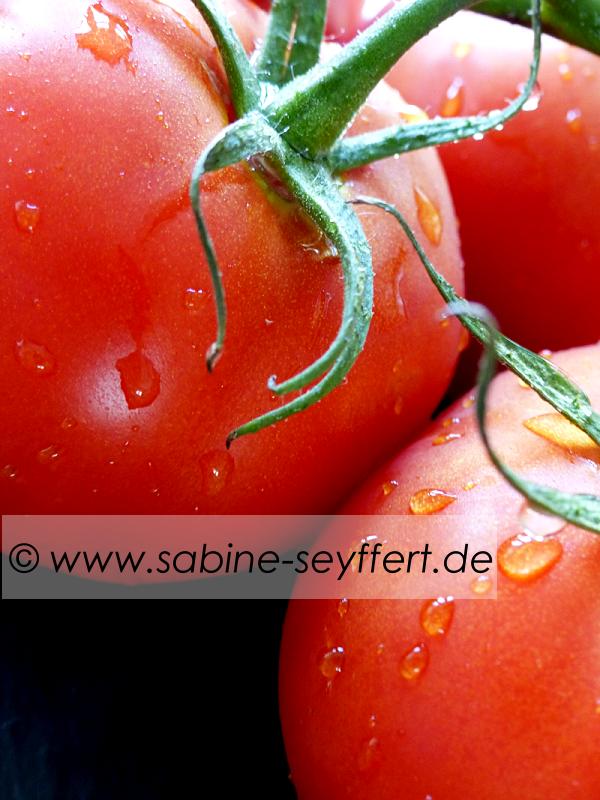 Währendessen beginnt man mit der Tomatensoße. Zuerst ritzt man die Schale der Tomaten mehrfach ein und übergießt diese mit heißem Wasser, so dass sich die Schale abziehen lässt. Außerdem entfernt man von Oben den Strunk aus den Tomaten.